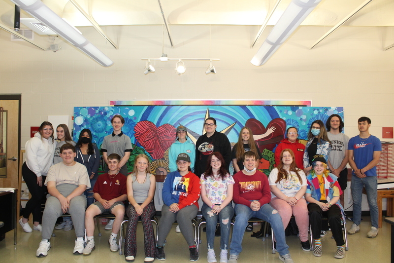 The 2022 Advanced Painting class collaboratively planned, designed, and created the Mural entitled, Close Knit, to visually represent the formative experience of growing up in Garrard County. Students created a survey to gather information about students' different perspectives about their community experiences. The art students identified strong themes that resonated from the feedback found in the surveys. The title, Close Knit, came from the recurring phrase describing Garrard as a small, rural town full of people closely tied together. Alison Stiles, class of ‘22, designed the heart shaped ball of yarn to communicate this theme. The class chose to add an unraveled string of yarn throughout the mural to represent the students journey in this close knit community. “You may leave, but you take a piece of Garrard with you as you go.” The theme of rural landscape can be seen in the barn, silo, rolling hills, and raked hay fields. Students realize that agriculture, though not as prevalent as it once was, is still valued for the rural landscape and farming culture. The image in the center borrows the Garrard Judicial Center’s fountain compass, designed by Riley Winkler class of ‘24, reinterpreted as the sunrise over the classic Kentucky image of two friends shaking hands as seen in our State’s flag, designed by Abigail Nicodemus class of ‘22. Together, the two symbols represent the students desire to find their direction, realizing that teachers are guiding lights as they learn and grow, and show the welcoming nature of Garrard countians. Audrie King, class of ‘22 chose to use the sunflower to represent Garrard students because they are bright, grow quickly, and turn toward the light (knowledge) for strength. The second large heart wrapped in an embrace is designed by Miles Terry class of ‘24. It represents a repeating theme that students feel that their peers are accepting and friendly. They recognize and value the diversity in our community. Riley Winkler, class of ‘24, also designed the mascot montage to show the importance that each school has on the success of all its Garrard graduates. Lastly, the background pattern of bubbles were added to communicate the innocence and youthful nature of the mural. This mural was created by the students, for the students of Garrard. The bubbles are symbolic of the hopes and dreams that each student has to become successful citizens. This project was led by Kristin Long, visual art teacher at GCHS.